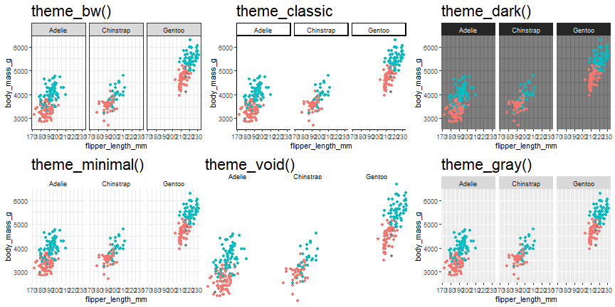 ] -- ```r *g + geom_point(aes(color = sex))+ facet_wrap(~ species) ``` <!-- --> --- #Themes .footnote[