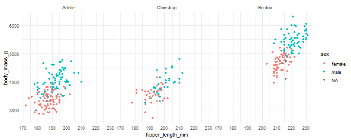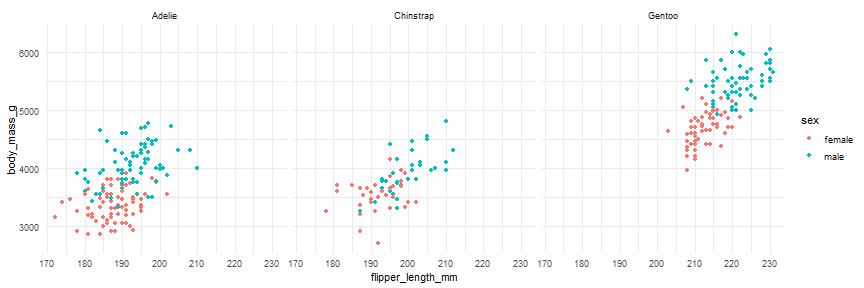] -- ```r g + geom_point(aes(color = sex))+ * facet_wrap(~ species)+ theme_minimal() ``` <!-- --> --- #Data Visualization with {ggplot2} .footnote[