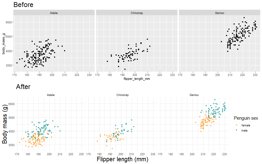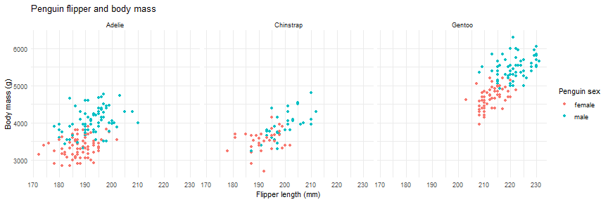 ] -- ```r ggplot(data = penguins %>% drop_na(), aes(x = flipper_length_mm, y = body_mass_g)) + geom_point(aes(color = sex))+ facet_wrap(~ species)+ theme_minimal()+ * labs(title = "Penguin flipper and body mass", x = "Flipper length (mm)",#renaming x axis y = "Body mass (g)",#renaming y axis color = "Penguin sex") #renaming legend title ``` <!-- --> --- #Data Visualization with {ggplot2} .footnote[