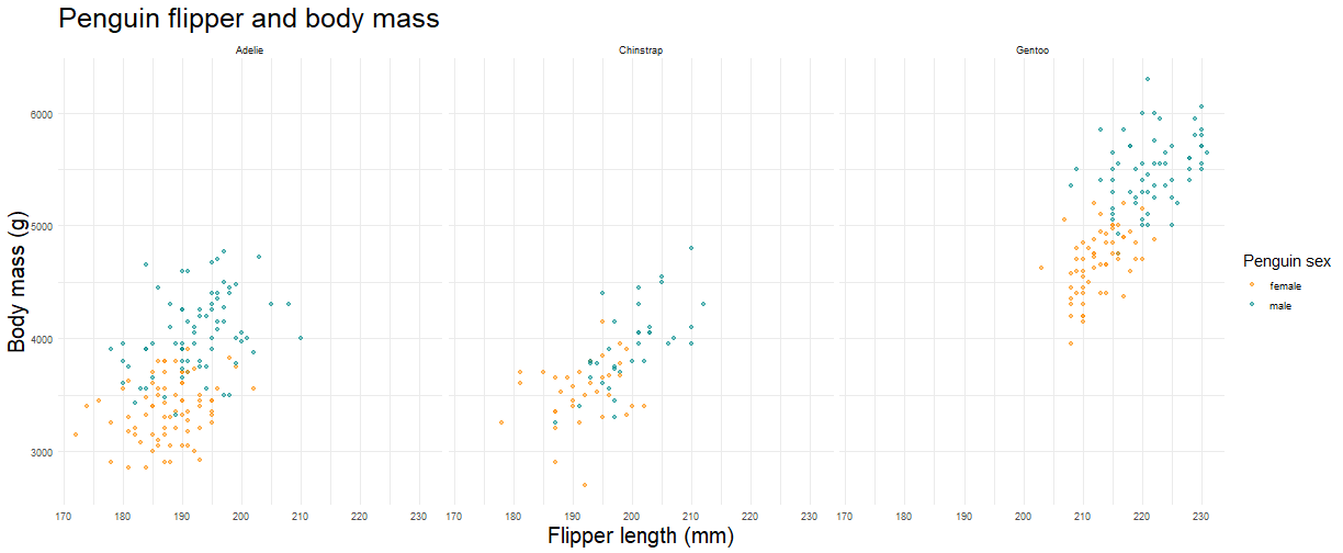 ] .panelset[.panel[.panel-name[] .panel[.panel-name[Code] ```r ggplot(data = penguins %>% drop_na(), aes(x = flipper_length_mm, y = body_mass_g)) + geom_point(aes(color = sex), alpha = 0.50)+ facet_wrap(~ species)+ theme_minimal()+ labs(title = "Penguin flipper and body mass", x = "Flipper length (mm)", y = "Body mass (g)", color = "Penguin sex")+ scale_color_manual(values = c("darkorange","cyan4"))+ theme(axis.title.x = element_text(size = 20), axis.title.y = element_text(size = 20), legend.title = element_text(size = 15), plot.title = element_text(size = 25)) ``` ] .panel[.panel-name[Plot] <!-- --> ] ]] --- #Data Visualization with {ggplot2} .footnote[