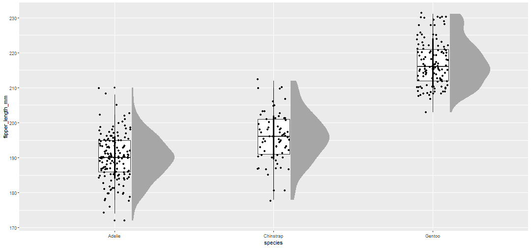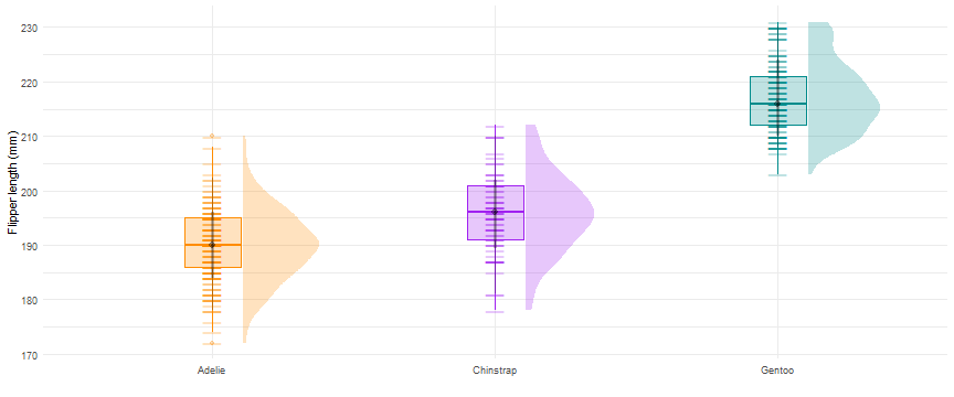 ] -- ```r ggplot(data = penguins, aes(x = species, y = flipper_length_mm))+ geom_boxplot(width = 0.2)+ geom_jitter(width = 0.1)+ * ggdist::stat_halfeye(width = 0.3,justification = - .4) ``` <!-- --> --- #Data Visualization with {ggplot2} .footnote[