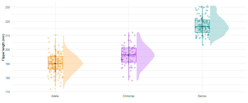] .panelset[.panel[.panel-name[] .panel[.panel-name[Code] ```r ggplot(data = penguins, aes(x = species, y = flipper_length_mm, fill = species))+ geom_boxplot(width = 0.2, alpha = 0.25, aes(color = species) )+ geom_jitter(width = 0.1, size = 2, alpha = 0.25, aes(color = species))+ ggdist::stat_halfeye(width = 0.3,justification = - .4, alpha = 0.25)+ scale_fill_manual(values = c("darkorange","purple","cyan4"))+ scale_color_manual(values = c("darkorange","purple","cyan4"))+ theme_minimal()+ theme(legend.position = "none")+ labs(x = "", y = "Flipper length (mm)") ``` ] .panel[.panel-name[Plot] <!-- --> ] ]] --- #Data Visualization with {ggplot2} .footnote[