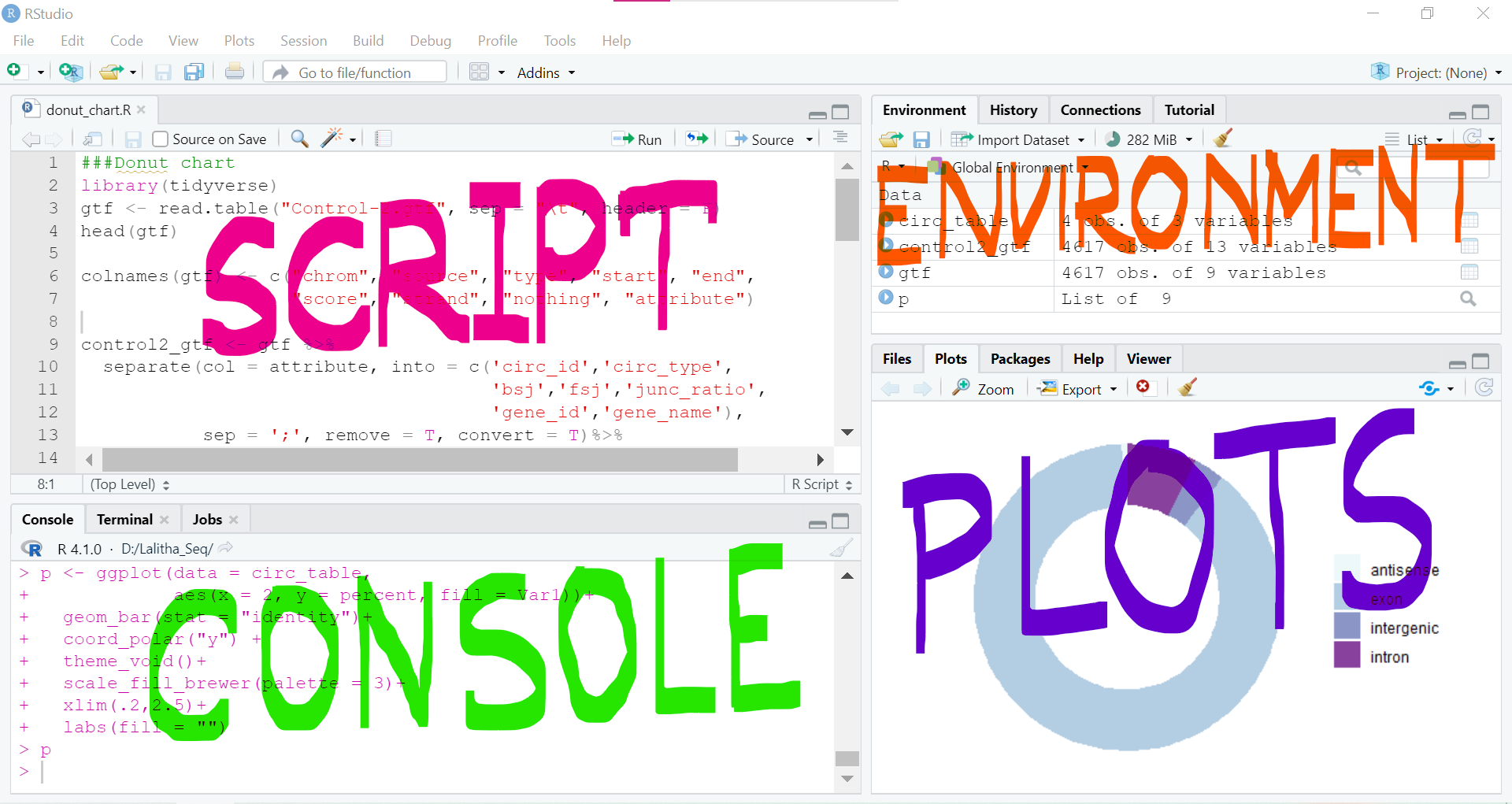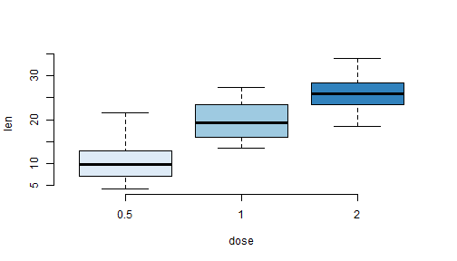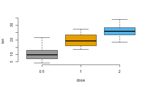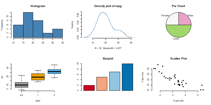 ] -- .pull-left[ ```r df[, "island"] ``` ``` ## # A tibble: 344 x 1 ## island ## <fct> ## 1 Torgersen ## 2 Torgersen ## 3 Torgersen ## 4 Torgersen ## 5 Torgersen ## 6 Torgersen ## 7 Torgersen ## 8 Torgersen ## 9 Torgersen ## 10 Torgersen ## # i 334 more rows ``` ] -- .pull-right[ - Prints the data stored in "island" column ] --- # Matrix -- - In a data frame the columns contain different types of data, but in a matrix all the elements are the same type of data. -- - A matrix in R is like a mathematical matrix, containing all the same type of thing (usually numbers). -- - For example when we work with RNA-Seq data we use a matrix of read counts. So it will be worth our time to learn to use matrices as well. -- ```r is.data.frame(mtcars) ``` ``` ## [1] TRUE ``` -- ```r is.matrix(mtcars) ``` ``` ## [1] FALSE ``` --- # Matrix -- ### Convert Data frame to matrix ```r mat <- as.matrix(mtcars) ``` -- ### Check the matrix ```r is.matrix(mat) ``` ``` ## [1] TRUE ``` --- # Generic X-Y Plotting ```r barplot(c(2,5,7,10)) ``` <!-- --> --- # Generic X-Y Plotting ```r library(RColorBrewer) ``` ``` ## Warning: package 'RColorBrewer' was built under R version 4.1.3 ``` ```r barplot(c(2,5,7,10), col = brewer.pal(n = 4, name = "RdBu")) ``` <!-- --> -- - To know more about `RColorBrewer` use `help("RColorBrewer")` --- # Generic X-Y Plotting ```r head(ToothGrowth) ``` ``` ## len supp dose ## 1 4.2 VC 0.5 ## 2 11.5 VC 0.5 ## 3 7.3 VC 0.5 ## 4 5.8 VC 0.5 ## 5 6.4 VC 0.5 ## 6 10.0 VC 0.5 ``` -- - The length of the odontoblasts (teeth) in each of 10 guinea pigs at three Vitamin C dosage levels (0.5, 1, and 2 mg) with two delivery methods (orange juice or ascorbic acid (Vitamin C)). --- # Generic X-Y Plotting ```r boxplot(len ~ dose, data = ToothGrowth, frame = FALSE, col = brewer.pal(n = 3, name = "Blues")) ``` <!-- --> --- # Generic X-Y Plotting ```r boxplot(len ~ dose, data = ToothGrowth, frame = FALSE, col = c("#999999", "#E69F00", "#56B4E9")) ``` <!-- --> --- # Generic X-Y Plotting ```r dat <- data.frame(group = c("Male", "Female", "Child"), value = c(25, 25, 50)) ``` -- ```r pie(dat$value, labels = dat$group, radius = 1, #$ sign used to select a column col = brewer.pal(n = 3, name = "PiYG")) ``` <!-- --> --- # Generic X-Y Plotting ```r hist(mtcars$mpg, col = "steelblue", xlab = "", main = "Histogram") ``` <!-- --> --- # Generic X-Y Plotting ```r # Compute the density data dens <- density(mtcars$mpg) # plot density plot(dens, frame = FALSE, col = "steelblue", main = "Density plot of mpg") ``` <!-- --> --- # Generic X-Y Plotting ```r # Create some variables x <- 1:10 y1 <- x*x y2 <- 2*y1 ``` --- # Generic X-Y Plotting ```r # Create a first line #p= points, l= lines, b = both, plot(x, y1, type = "b", frame = FALSE, pch = 19, col = "red", xlab = "x", ylab = "y") # Add a second line lines(x, y2, pch = 18, col = "blue", type = "b", lty = 2)#lty=1; solid line, lty=2;dashed line # Add a legend to the plot legend("topleft", legend=c("Line 1", "Line 2"), col=c("red", "blue"), lty = 1:2, cex=0.8) ``` <!-- --> --- # Generic X-Y Plotting ```r wt <- mtcars$wt # weight in pounds mpg <- mtcars$mpg #miles per gallon ``` -- ```r plot(wt, mpg, main = "Scatter plot", xlab = "X axis title", ylab = "Y axis title", pch = 19, frame = F) ``` <!-- --> --- # Generic X-Y Plotting - We have so far created the following plots <!-- --> --- # How to save a plot? - To save the plot as .tiff file, use ```r tiff(filename = "Boxplot.tiff", height = 4, width = 6, units = "in", res = 300) boxplot(len ~ dose, data = ToothGrowth, frame = FALSE, col = c("#999999", "#E69F00", "#56B4E9")) dev.off() ``` - To save the plot as .jpg file, use ```r jpeg(filename = "Boxplot.jpg", height = 4, width = 6, units = "in", res = 300) boxplot(len ~ dose, data = ToothGrowth, frame = FALSE, col = c("#999999", "#E69F00", "#56B4E9")) dev.off() ``` --- #Pipe %>% .footnote[