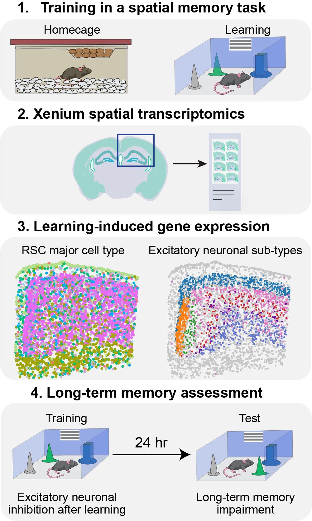 The retrosplenial cortex (RSC) is a critical brain region that is activated during spatial memory tasks and plays a crucial role in the consolidation of long-term memory. Various classes of RSC excitatory neurons across different laminar layers serve as the central hub for neuronal connections between the RSC and other brain regions, such as the hippocampus. Despite the established role of the RSC in spatial memory, the transcriptomic signature of the neuronal subtypes in the RSC during spatial memory consolidation remained elusive. Here, we used unbiased and targeted spatial transcriptomics to identify the RSC transcriptional signature after a spatial memory task. Genes related to transcription regulation, protein folding, and mitogen-activated protein kinase pathways were upregulated in the RSC during an early time window of memory consolidation. Furthermore, cell-type and excitatory neuronal layer-specific changes in gene expression were resolved using Xenium spatial transcriptomics. A deep learning computational tool uncovered cell-type-specific molecular activation patterns within the RSC after learning. Conversely, in a mouse model of Alzheimer’s disease and related dementia (ADRD) exhibiting tau hyperphosphorylation in the RSC, there was a reduction in predicted neuronal activation following learning. Notably, learning-induced Fos expression was decreased in excitatory neurons of the RSC in the ADRD mice. Finally, we observed that blocking RSC excitatory neurons during the early temporal window after learning using a chemogenetic approach impaired long-term spatial memory in adult mice. Our results reveal a molecular signature of the RSC after learning and emphasize the role of RSC excitatory neurons during spatial memory consolidation.